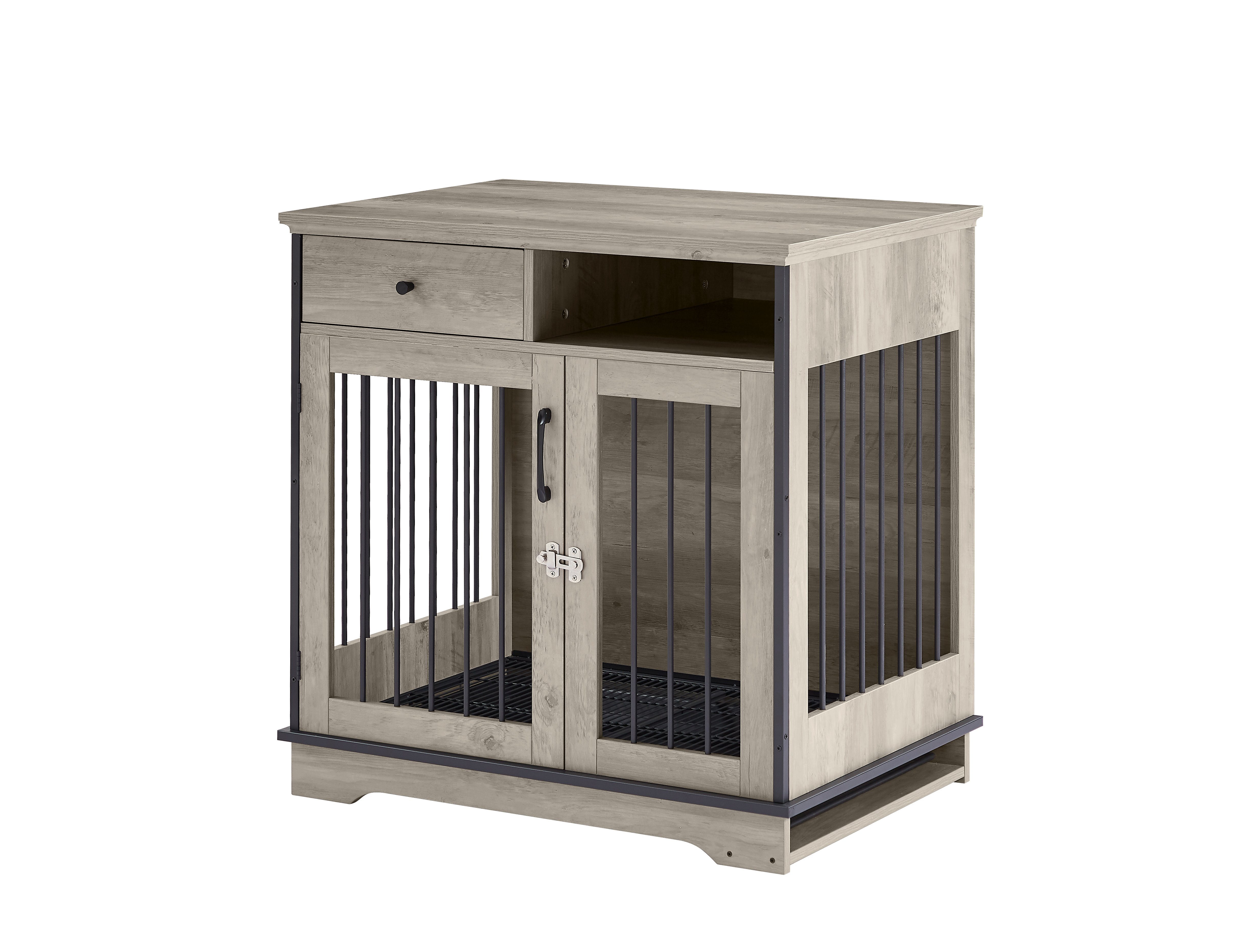 Dog crates; indoor pet crate end tables; decorative wooden kennels with removable trays.