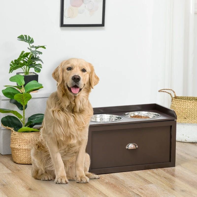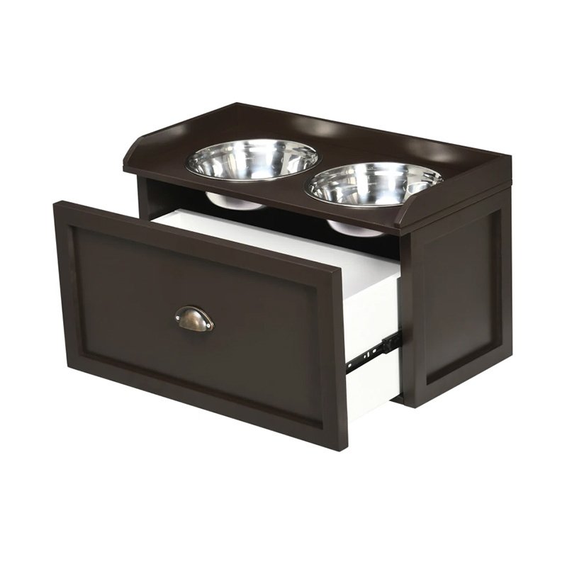 Large drawer for keeping everything under the food and water bowls, saving space.