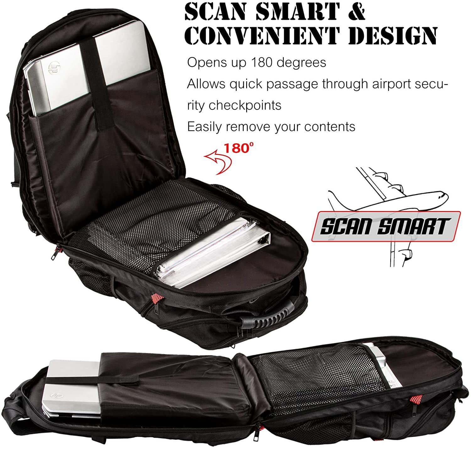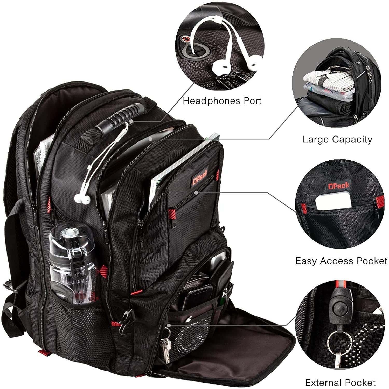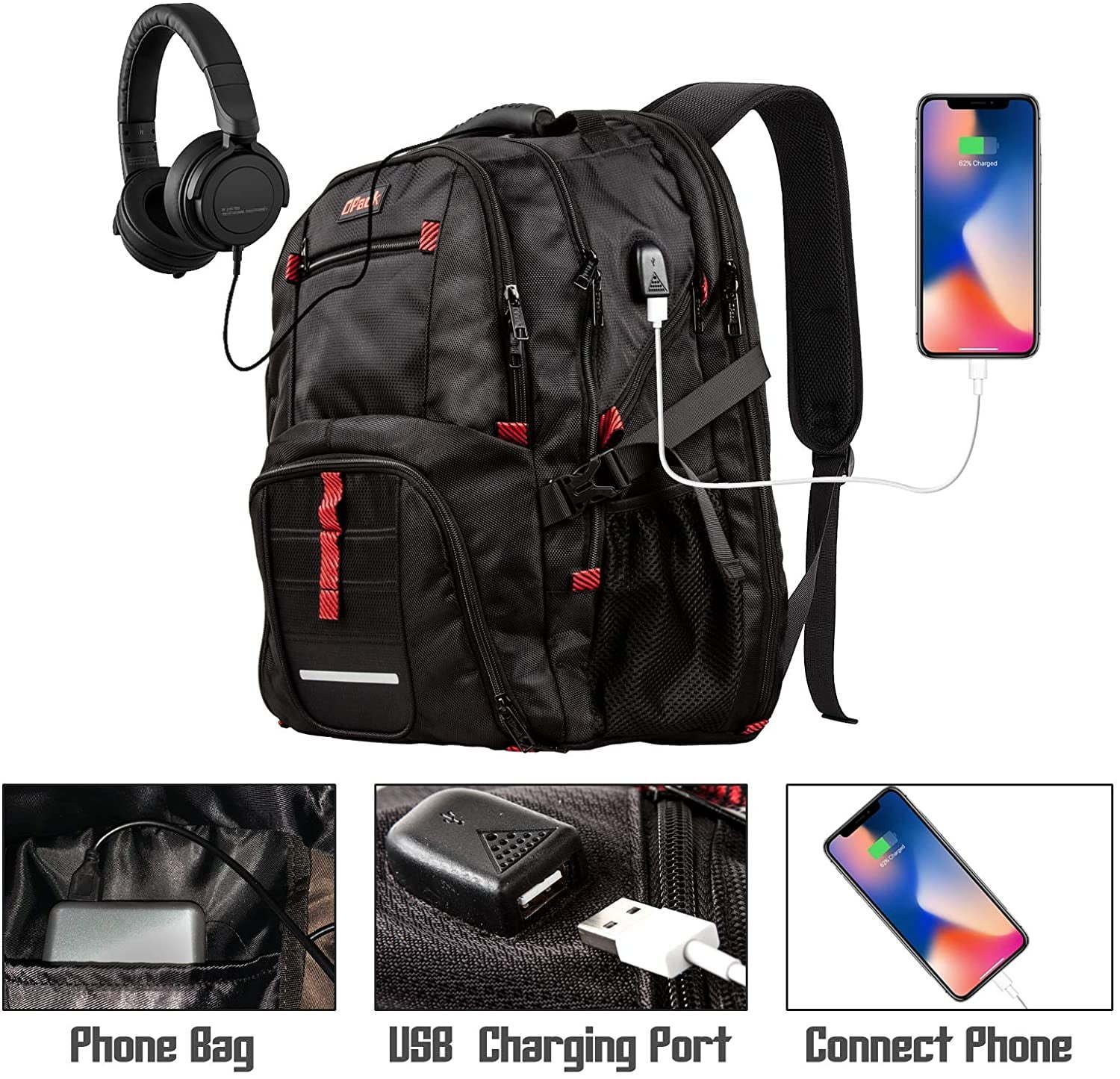 The LARGE CAPACITY travel Backpack has more than 20 independent organizer pockets, perfect for day-to-day use, occasional travel, and air travel. TSA Friendly: Quick access laptop compartment fits 17-inch laptops, opens up quickly at the airport security checkpoint, and ensures a hassle-free laptop-in-bag TSA scan. The USB Charging Port offers easy access to charge your devices. PREMIUM MATERIAL: Made of superior quality polyester fabric with high density nylon lining. Equipped with THREE large main compartments with Anti-theft zippers, adjustable side compression straps, a heavily padded back panel with airflow ventilation technology, and padded contour-shaped shoulder straps with mesh fabric. HEADPHONES hole: Helps you enjoy your favorite music on the go hands-free. RFID blocking pocket protecting your credit cards: An anti-theft pocket and luggage sleeve are designed on the back. A suitcase strap can secure a laptop backpack tightly on the suitcase. GREAT GIFT FOR YOUR LOVED ONES This is a great graduation gift for students of all ages, Versatile for people of all ages, and serves you well as a business backpack, and outdoor travel daypack, for college, high school, and middle school. Unisex design backpack for men, women, boys, girls, teens, and adults.USB PORT & HEADPHONES HOLE: External USB charging port with a built-in charging cable allows you to easily charge your smartphone, Kindle, and other electronics devices on the go (Portable power bank required and NOT included in this backpack). Headphone Jack is convenient for you to listen to your favorite music hands-free while walking.TSA FRIENDLY & MULTIPURPOSE: TSA-friendly feature exclusively designed for AIR TRAVEL, makes getting through airport security quick and easy by lying the laptop flat without removing it from the bag.The large capacity USB charging stylish backpack is a great travel backpack for OUTDOOR/INDOOR activities and perfect for daily use anywhere for camping, hiking, vacations, travel, trekking, mountaineering, weekend getaways, occasional travel, and overnight trips. The unisex design fits people of all gender and all ages.DIMENSIONS & LARGE CAPACITY: Size: 19.4 in × 10.4 in ×14.96 in. A large capacity of 45Liter with over 20 organizer pockets can meet your various needs. Large multi-compartment backpack with a padded sleeve for 13,13.3,14,15,15.6,17 Inch Laptops/Macbooks/computers for boys, girls, students, teens, adults, women, and men. Organizational compartments can be used for additional supplies and accessories such as iPhones, iPods, pens, keys, wallets, books, clothes, passports, and cell phones. Mesh water bottle pockets are on both sides.DURABLE MATERIAL & SOLID: Made of durable polyester fabric with heavy-duty, two-way waterproof zippers across the backpack are convenient to operate on whichever side you prefer, for a secure and long-lasting usage every day. With a rugged handle with steel cable on the top for easy carrying, Side compression straps keep the versatile stylish backpack in whatever size you need.BREATHABLE & COMFORTABLE: Padded and breathable mesh back panel prevents overheating, while also promoting air circulation. The adjustable and heavily padded shoulder straps are made of honeycomb breathable material, Ergonomic design ensures the dispersion of gravity of the backpack, and makes the backpack comfortable to wear even when loaded with all your gear. The perfect gift for your loved ones on Thanksgiving Day, Christmas Day, Mother's Day, and Father's Day.RFID BLOCKING POCKETS: A small RFID-designed pocket close to your body keeps your credit cards safe in crowded areas.