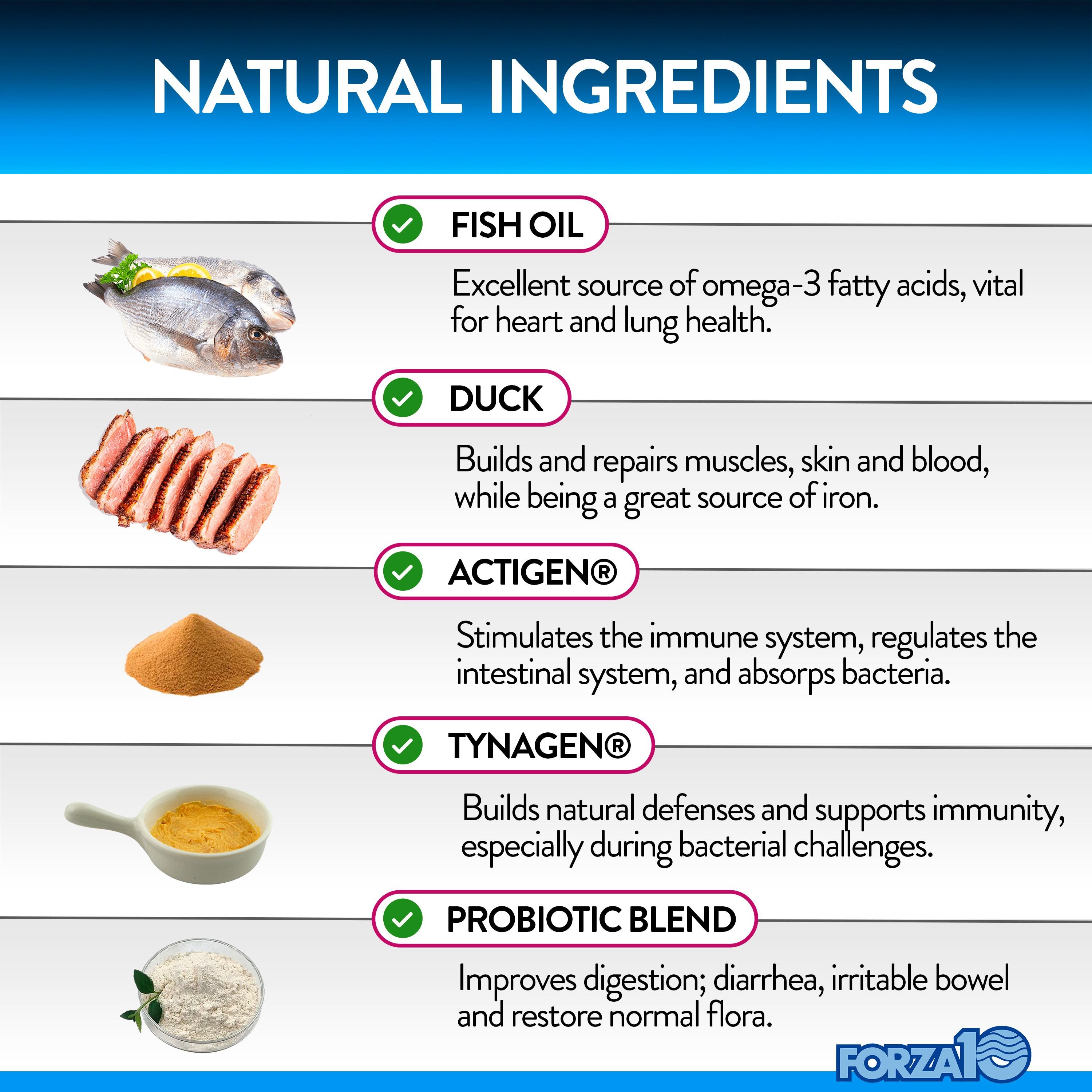 Actigen® (Hydrolyzed Yeast & Brewer's Dried Yeast), Enzyme Blend - Amylase (Aspergillus oryzae), Protease (Aspergillus oryzae), Lipase (Aspergillus niger), Cellulase (Trichoderma reesei), Papain (Papaya), Bromelain (Anamas comosus), Hemicellulase (Trichoderma reesei), Fish Oil (Sardine, Mackerel, Herring, Anchovy), Chicory Root (Inulin), Tynagen® (Liquid Lactobacillus acidophilus fermentation product), Probiotic Blend (Lactococcus lactis, Lactobacillus plantarum, Lactobacillus acidophilus, Lactobacillus brevis, Bifidobacterium bifidum, Lactobacillus fermentum and Enterococcus faecium), Brewer's Yeast, Citric Acid, Coconut Glycerin, Duck Digest, Duck Fat, Flaxseed, Mixed Tocopherols, Oat Flour, Palm Fruit Oil, Powdered Cellulose, Rosemary Extract, Sorbic Acid, Sunflower Lecithin.