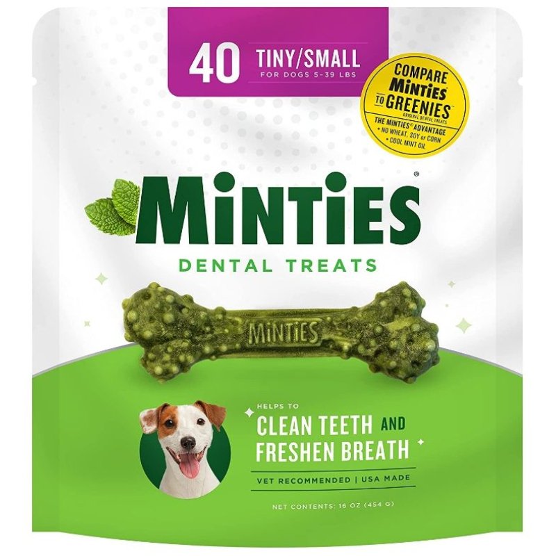 Minties is the affordable dog dental chew made from ingredients your dog will love. Contains no wheat, soy, corn, artificial flavor, or animal by-products. The unique design encourages dogs to chew, helping to remove plaque, tartar, and bad breath at its source.
