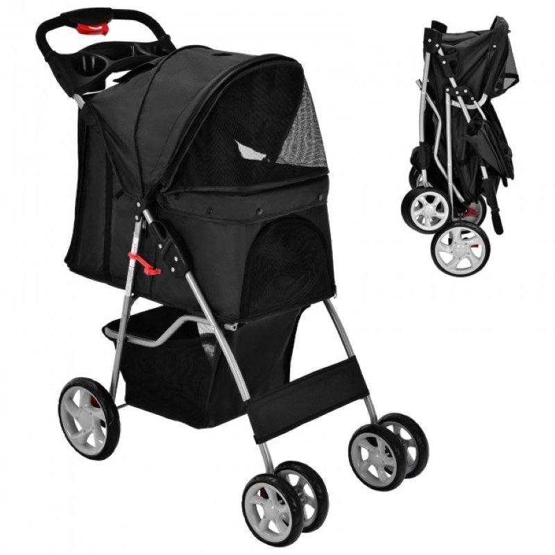 4 mesh windows provide good air ventilation and a great viewA smooth zipper allows you to remove the mesh if necessaryStable iron frame built for long-lasting service without deformation33 lbs large bearing capacity suitable for most small and medium petsThe one-hand simple mechanism makes it quick to fold the strollerA safety belt can prevent the pet from falling or running outEVA wheels with shock absorption make walking more effortlessThe extra pad inside the cart for added comfortAdjustable canopy to protect your pet from rain and sunLarge storage basket and storage bracket allow you to take all necessities with you and release your hands.